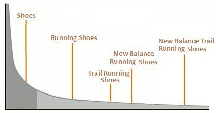 높은 목표를 가진 키워드는 제품 또는 서비스에 대한 추가 세부 정보가 포함된 롱테일 키워드가 되는 경향이 있습니다. 아래 그래프의 왼쪽에 있는 키워드는 일반적인 다량의 키워드이고 오른쪽에 있는 키워드는 롱테일 키워드입니다.