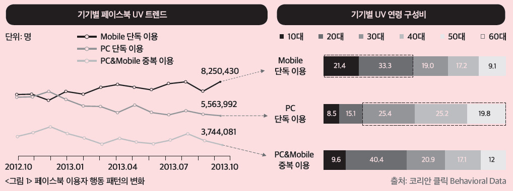이러한 행동 패턴 변화는 다양한 곳에서 나타난다. 네이버와 구글을 포함한 검색엔진 검색 쿼리 점유율에서 모바일 환경점유율이 웹 환경을 넘어서기 시작했으며, 이에 따라 웹 검색 이용 수치 또한 본격적으로 감소하고 있다. 그리고 이와 유사한 트렌드가 페이스북 이용자 행동 패턴에서도 그대로 보여진다. 페이스북은 설립 이래로 웹 환경에서 독보적인 SNS 서비스를 제공하고 있다. 그런데 <그림 1>처럼, 2013년 초에는 PC와 모바일 이용자가 비슷한 점유율을 보이다가 2016년에는 모바일에서의 ‘Share of Time’이 현저하게 상승하는 현상이 당연시 된다. 우리는 이 표를 통해 다음과 같은 두 가지 시사점을 끌어낼 수 있다. 소비자가 모바일 기기를 주 소비 매체로 활용하기 시작했고 PC는 보조 소비 매체로 변화하고 있다는 점, 그리고 페이스북은 이러한 변화과정에서 비즈니스 중심축을 모바일로 이동시키는 데 성공했다는 점이다.