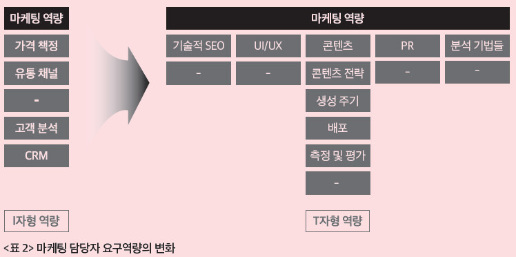 ‘기술의 진화’가 소비자 라이프 스타일 자체를 바꿨고, 이에 따라 수많은 마케팅 방법이 생기면서 마케팅 담당자에게 요구되는 역량 역시 변화하고 있다. 지금까지는 마케팅 담당자에게 가격 책정, 유통 채널같은 마케팅 영역의 깊은 지식을 습득하는 I자형 역량을 요구해왔다. 하지만 이제는 기술적 SEO(Search Engine Optimization), UI/UX 영역 같은 마케팅 지식과 같은 다양한 지식을 포괄적으로 이해하면서 콘텐츠 영역에 대한 깊은 지식을 지닌 T자형의 융합형 역량을 요구한다. 이러한 융합형 역량이 실전 마케팅 전략 수립에서 어떻게 활용되는지 실전 마케팅 전략 가이드를 통해 살펴보도록 하자.