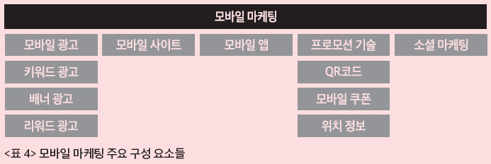 위에서 언급했던 내용처럼 모바일 인터넷 사용시간의 빠른 증가에 따라 소비자 라이프 스타일이 변화하고 있지만, 많은 회사가 현재 어떠한 일이 벌어지고 있는지 잘 이해하지 못하고 있는 것으로 보인다. 이러한 변화의 시기에 트렌드를 이해하고 적절한 전략을 수립해 실행하는 몇몇 회사는 큰 성공을 거두게 될 것이다. 모바일 마케팅 전략을 수립하기 위해서는 먼저 모바일 마케팅을 구성하는 주요 요소에 대한 이해가 선행돼야 한다. 아래 <표 4>를 통해 모바일 마케팅 주요 구성 요소에 대해서 살펴보자.