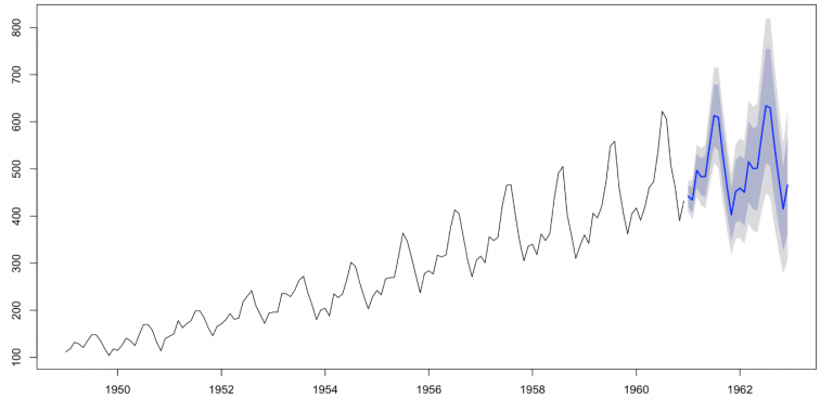 예측은 통제 또는 비교 집단이 없을 때 사용해야 합니다. 이는 사이트 전반의 변화에 적합한 옵션입니다. 분석을 실행하기 위해 시계열 데이터 즉, 일정한 간격(매일, 매주, 매월 등)으로 수집된 데이터를 사용합니다. 단일 변수 시계열 데이터의 경우 일일 총 트랜잭션을 가져온 다음, “예측” 패키지를 사용하여 변경이 발생하기 전 데이터를 분석할 수 있습니다.