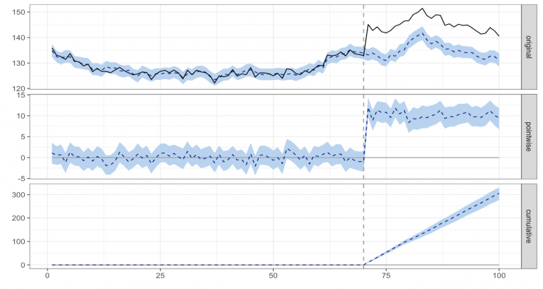 세 번째 패널은 두 번째 패널의 각 점에서의 원인이 추가되어 개입의 누적 효과의 좌표가 그려집니다. 예측 및 인과 영향 모델을 수행하는 많은 R 및 파이썬 패키지가 있습니다.