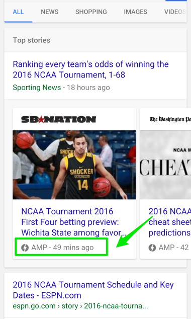 다음은 AMP에 최적화된 페이지가 검색 결과에 어떻게 표시되는지 보여줍니다.