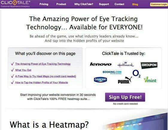 예를 들어, 2012 년에 ClickTale은 경쟁 업체(CrazyEgg’s)의 웹 사이트 디자인과 카피 일부를 따라 했습니다. 두 스크린샷을 비교해보세요.