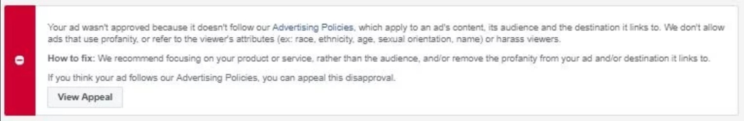 이 시스템의 가장 큰 문제는 여러분의 광고를 거부할 때 문제점을 수정하기 위한 그 어떤 인사이트도 제공하지 않는다는 것입니다. 이 얘기가 친숙하게 들린다면, 행운으로 여기십시오. 제가 좀 파헤쳐본 결과, 정확히 왜 페이스북이 광고를 거부하는지 그리고 다시 승인 받기 위해서는 어떻게 광고를 수정할지 몇몇 예시들과 함께 알아냈습니다.
