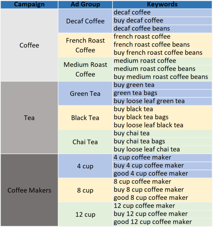 하나의 광고 그룹 내의 모든 키워드가 해당 광고 그룹 내의 모든 키워드에 대해 말할 수 있을 정도로 얼마나 충분히 밀접하게 연관되어 있는지 확인해 보십시오. 이 개념은 매우 중요합니다. “녹차”를 검색하는 사람이 12컵 커피메이커에 대한 광고를 받는 것을 원하지 않을 것입니다. 전략적 계정 조직은 이를 방지하는 방법입니다.