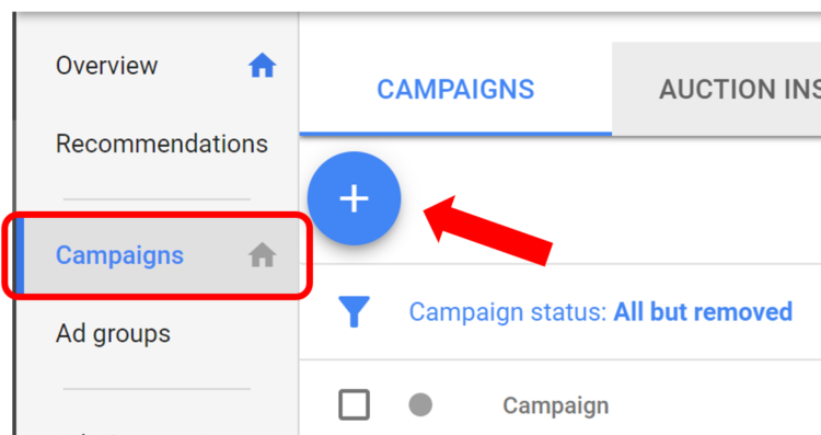 흥미로운 캠페인을 하나 선택하여 첫 번째 캠페인을 만드십시오. 왼쪽 열에 있는 ‘캠페인’ 탭으로 이동하여 파란색 ‘+’버튼을 클릭하십시오.