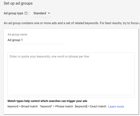 간단하고 설명적인 광고 그룹 이름을 입력하고 해당 광고 그룹의 모든 키워드를 상자에 붙여 넣으십시오.