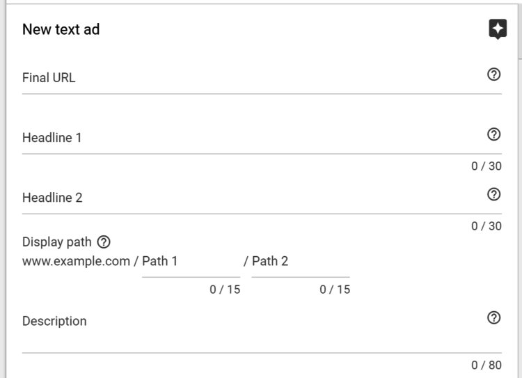 애드워즈의 글자 광고는 다음과 같은 형식으로 작성됩니다. 30자짜리 헤드라인 2개, 80자짜리 설명 문구 1개, 광고에 표시되는 가상 URL (사용자 도메인+15자의 파일 경로 2개) 및 트래픽을 전송할 최종 URL.