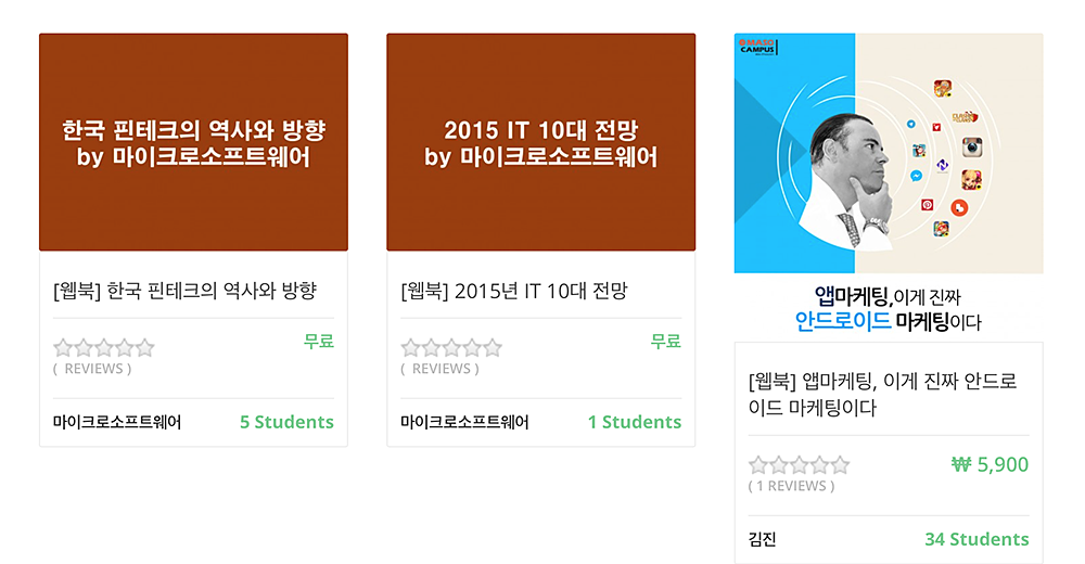 IT 실무교육 전문기관인 마소캠퍼스가 디지털 웹북 서비스를 시작했다. 이번에 공개된 자료는 ‘2015년 IT 10대 전망’과 ‘한국 핀테크의 역사와 방향’로, 무료로 서비스된다. 이와 함께 공개된 ‘앱마케팅, 이게 진짜 안드로이드 마케팅이다’의 경우 유로 서비스다. 무료 웹북은 회원가입을 하지 않아도 마소캠퍼스의 LMS에서 볼 수 있다. 유료서비스도 특정 챕터는 ‘맛보기 무료’를 통해 일부 열람할 수 있다. 해당 웹북을 PDF로 보기 위해서는 로그인이 필요하다.
