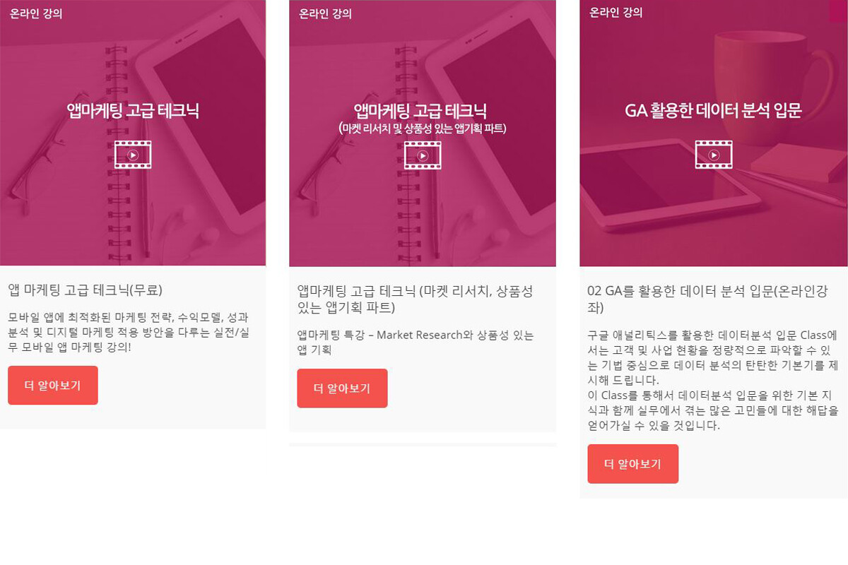 무료로 제공되는 강의는 ‘ 앱마케팅 고급 테크닉(온라인 강의)와 앱마케팅 고급 테크닉 (마켓 리서치 및 상품성 있는 앱기획 파트 - 온라인 강의) ’이다. 이 강의는 모바일 앱 자체가 제품인 경우와 채널인 경우를 구별하여 아이디어 발굴 요령과 오픈 소스 활용법, 시장 통계 자료를 이용한 타겟 버전 설정법 등을 다룬다. 부분 유료로 제공되는 강의는 ‘ GA 활용한 데이터 분석 입문(온라인 강의)’ 이다. 이 강의는 데이터 분석을 위한 데이터 유형, KPI 설정, 필수 개념 등의 기반 지식 뿐만 아니라 구글 애널리틱스의 이용법, 구글 애널리틱스를 활용한 디지털마케팅 채널 효과 측정 모델 등을 4시간 동안 실습한다.