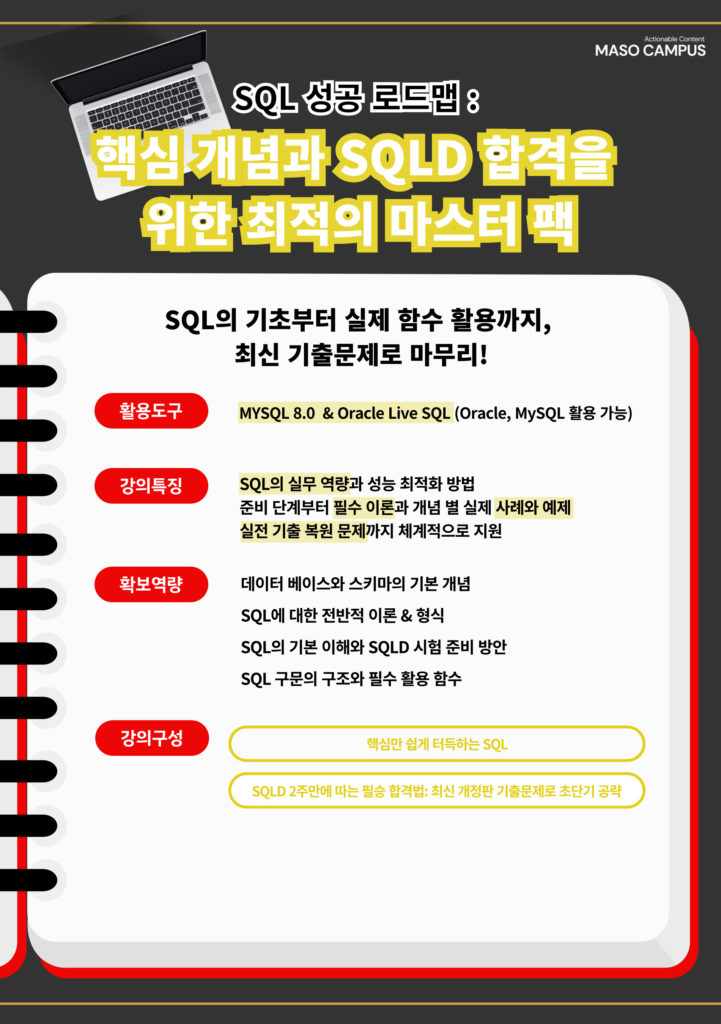 SQL 기초부터 고급 기능까지 탄탄하게 학습하고, SQLD 자격증을 단기 내에 취득할 수 있도록 설계된 패키지!