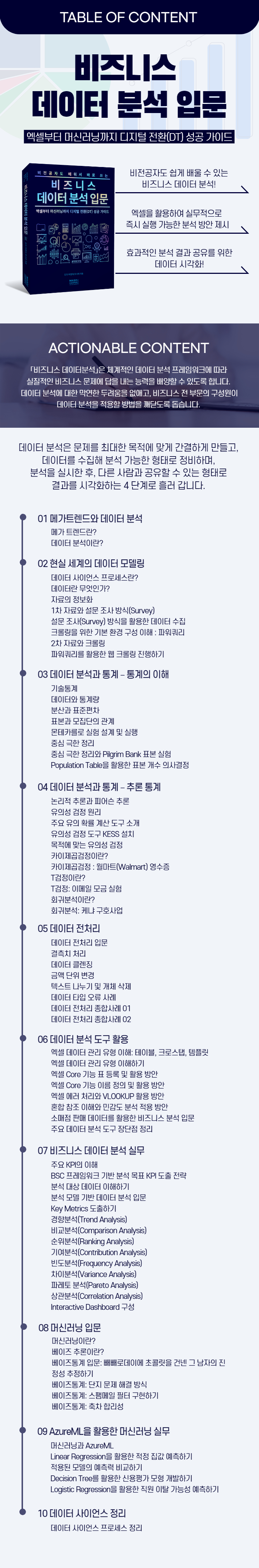 모든 것이 데이터로 이루어진 시대, 누구라도 배울 수 있는 역대급 길잡이 도서! 이 시대의 수많은 실무자에게 엑셀부터 머신러닝까지 즉시 실행 가능한 데이터 분석 전략 기법을 제공합니다.