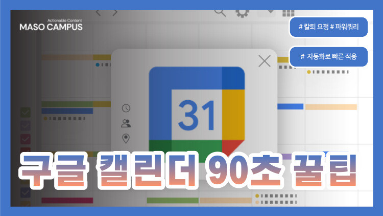 마소캠퍼스의 <구글 캘린더 90초 꿀팁> 강의에서는 구글 캘린더의 유용한 기능 중 핵심 기능을 압축적으로 제시합니다.