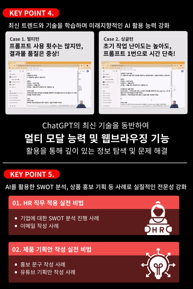 다양한 실무 시나리오를 바탕으로 AI 기반 HR 컨설팅, 제품 기획, 전략 수립 등의 분야에서 AI 활용을 통한 경쟁력 강화