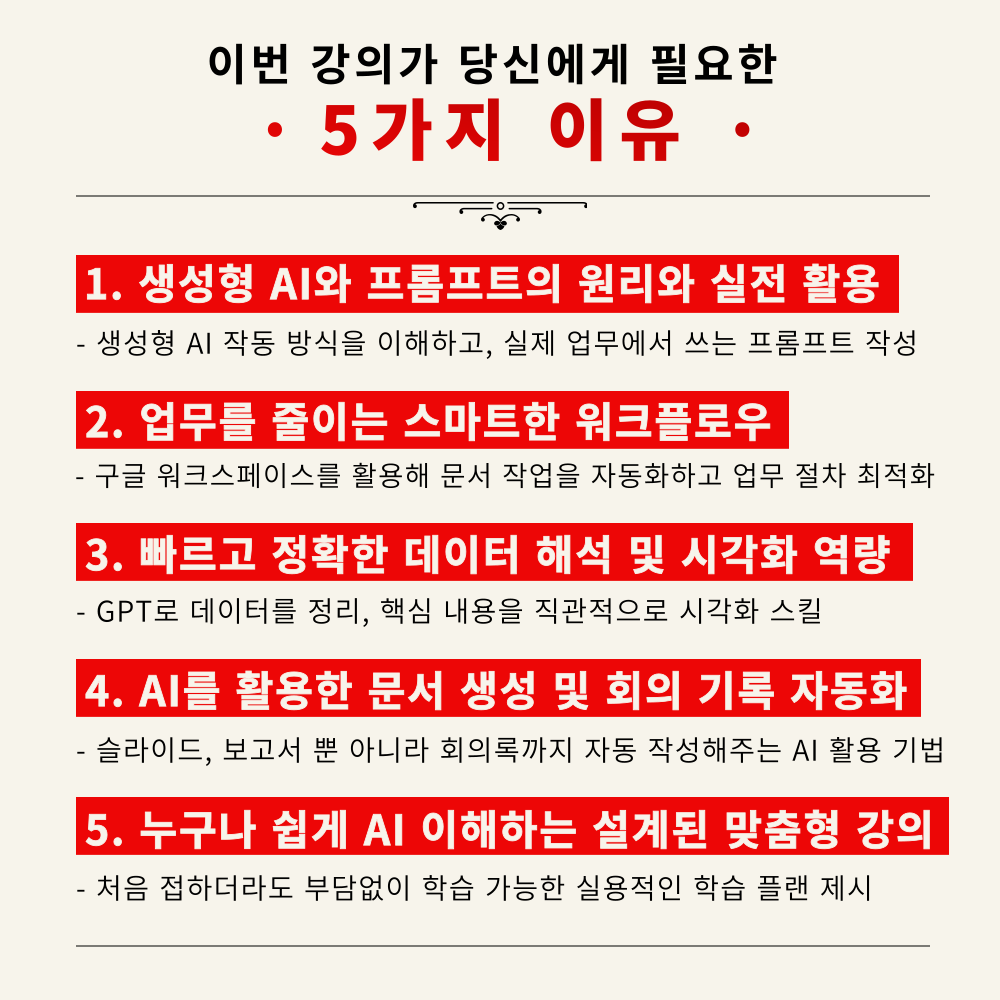 생성형 AI 프롬프트 지식, 구글 워크스페이스 및 AI Agent 활용법 등의 실질적인 스킬 습득