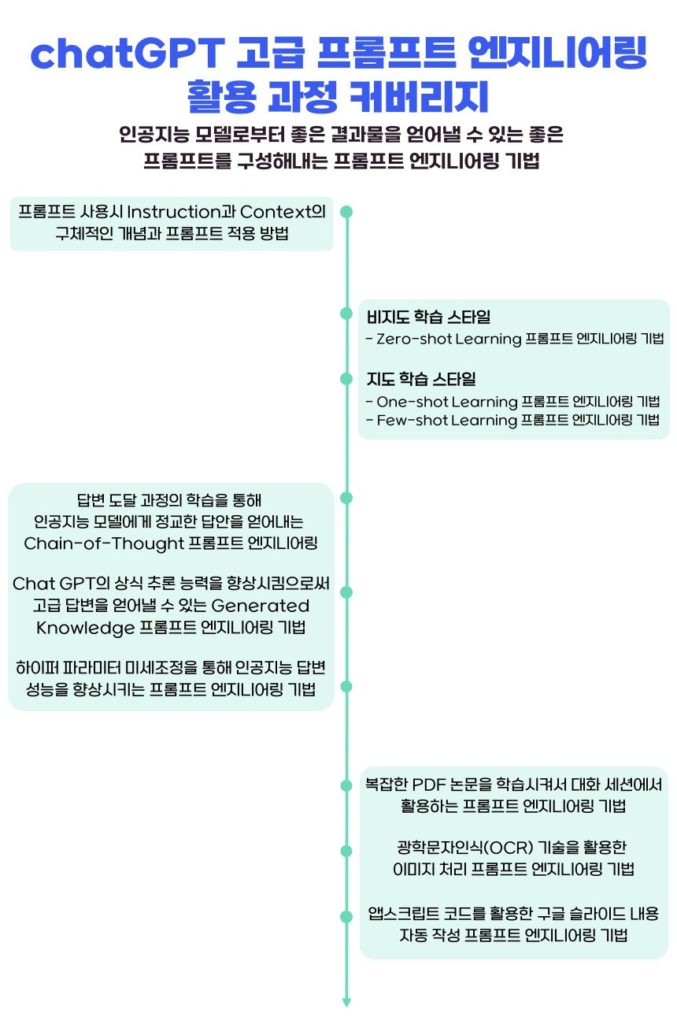 chatGPT 고급 활용법 강좌에서는 인공지능 모델의 모든 성능을 이끌어낼 수 있는 프롬프트 엔지니어링에 대해서 개념부터 고급 기법까지 제시하면서,