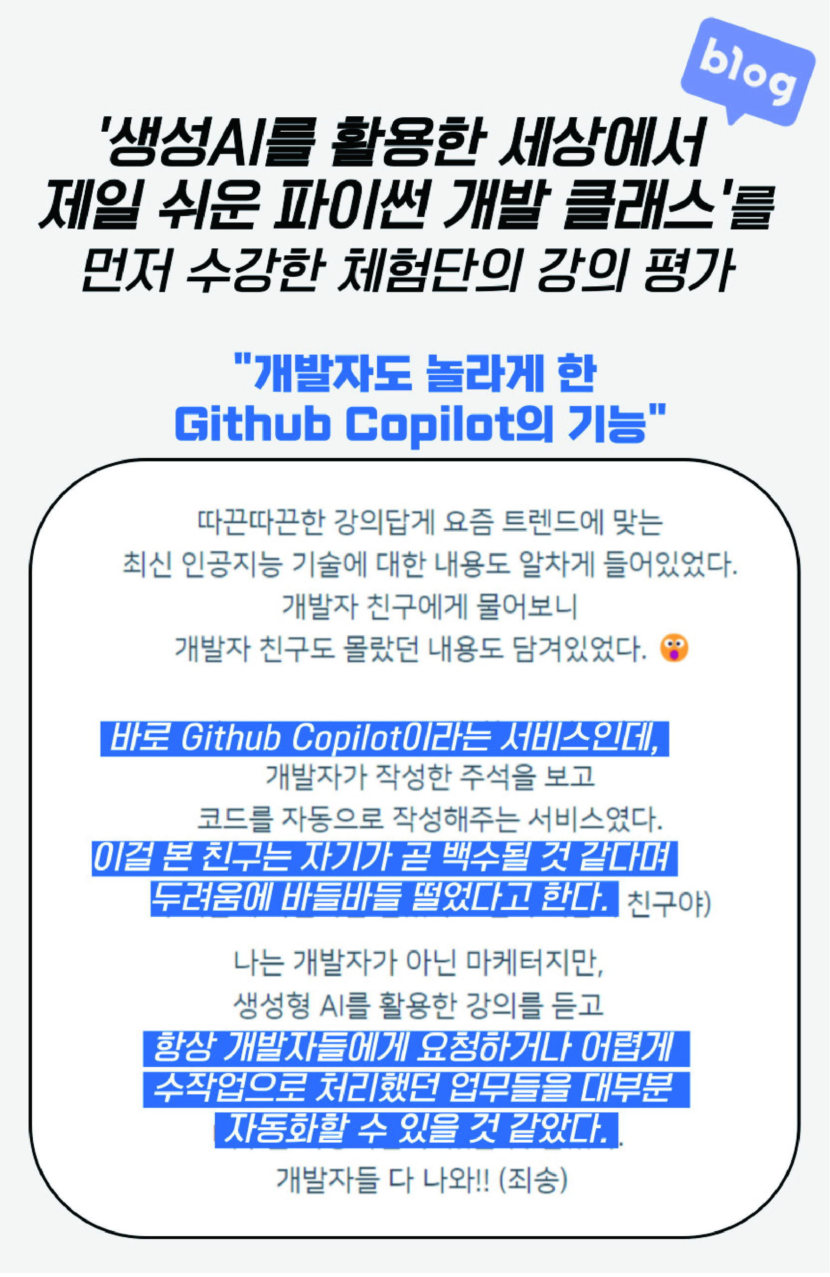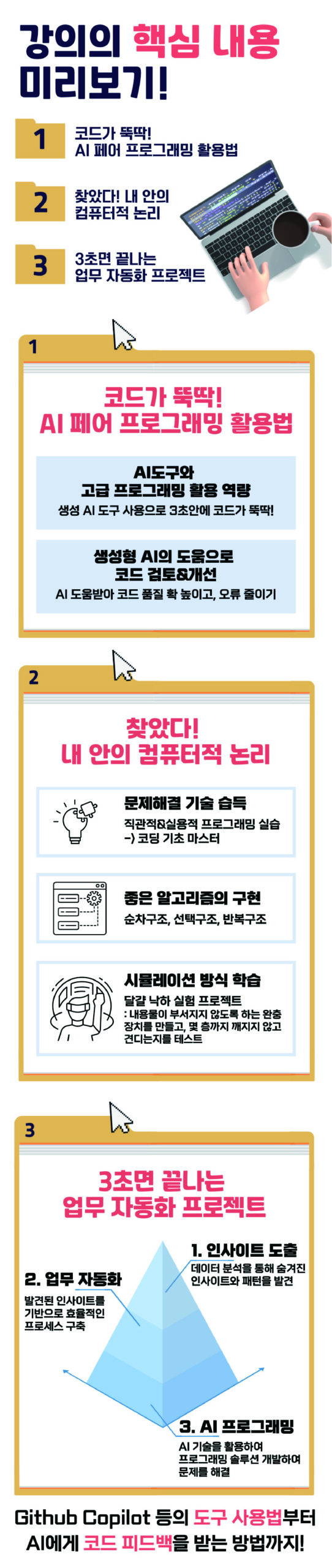 ▶ Github Copilot, ChatGPT 등 최신 AI 도구를 활용하여 실시간 코딩 지원과 고품질 코드 생성 실습 제공