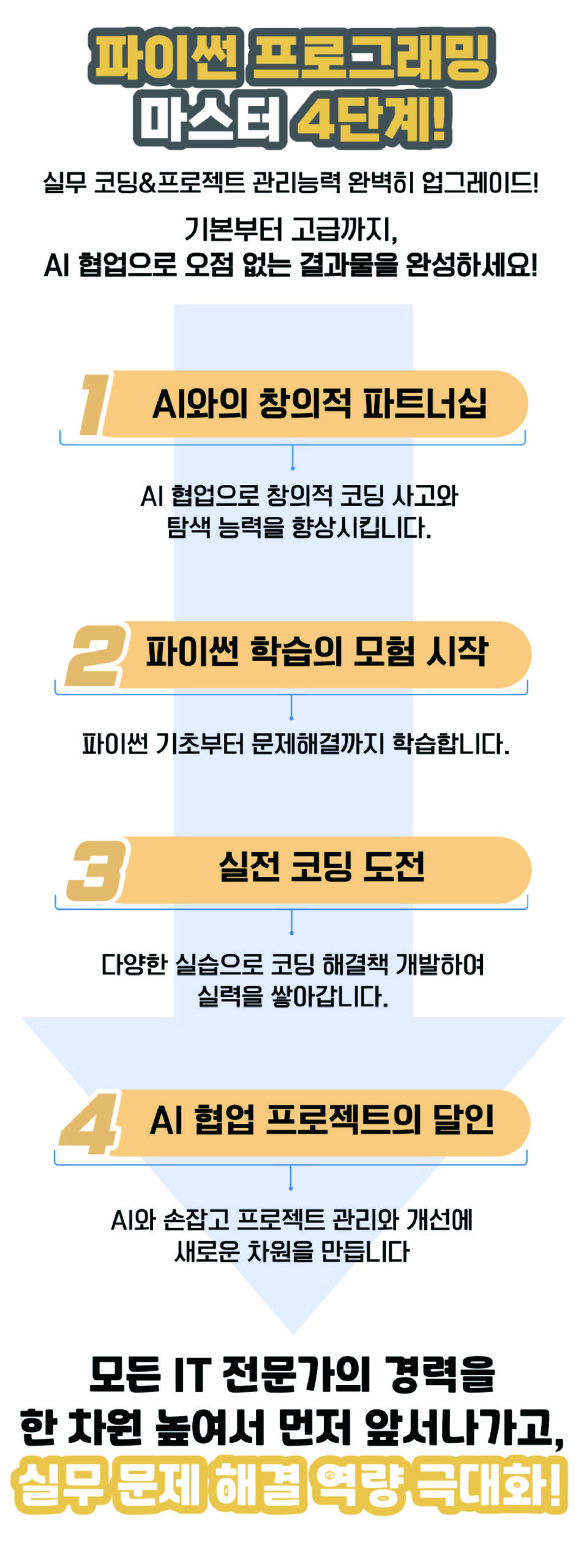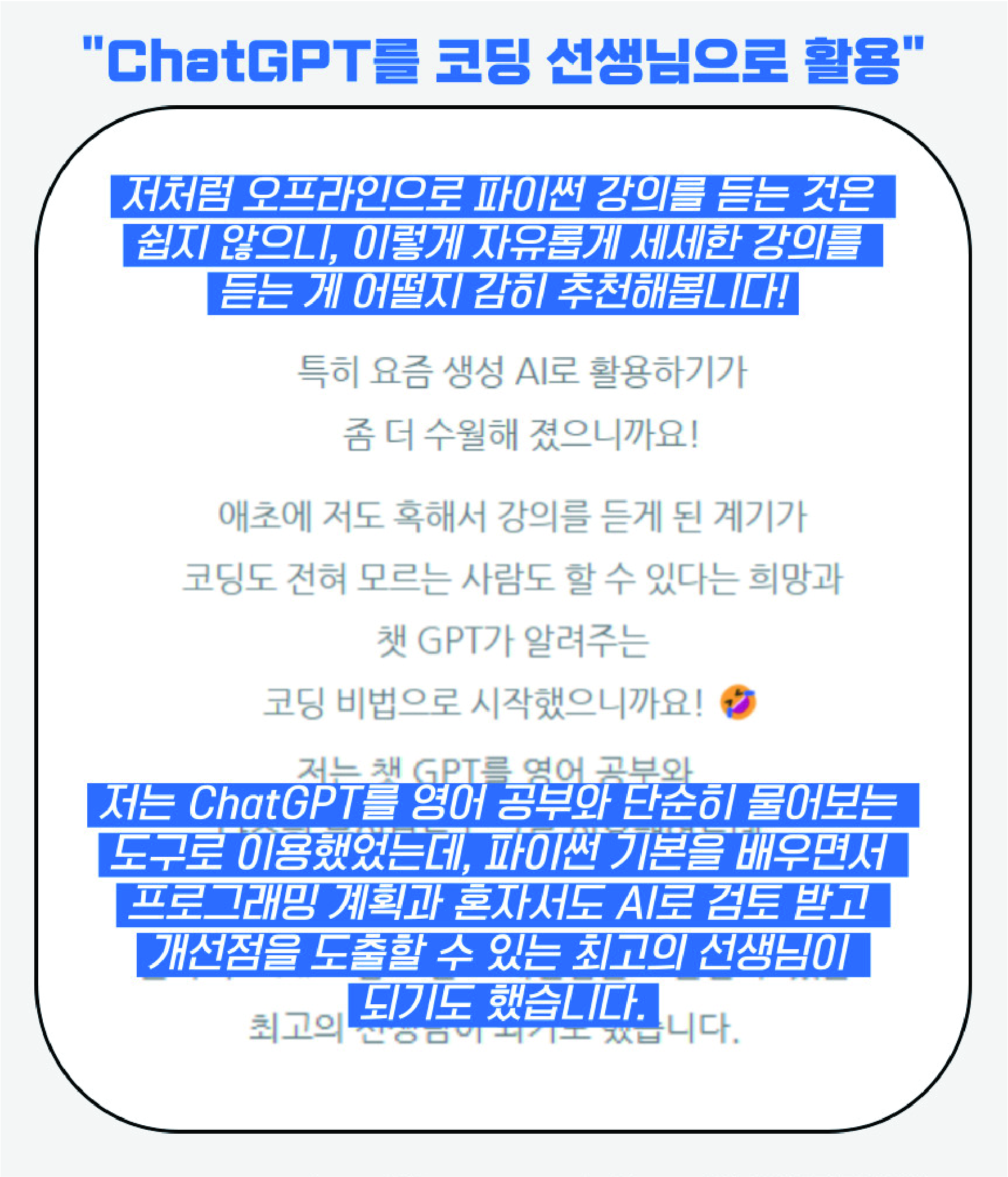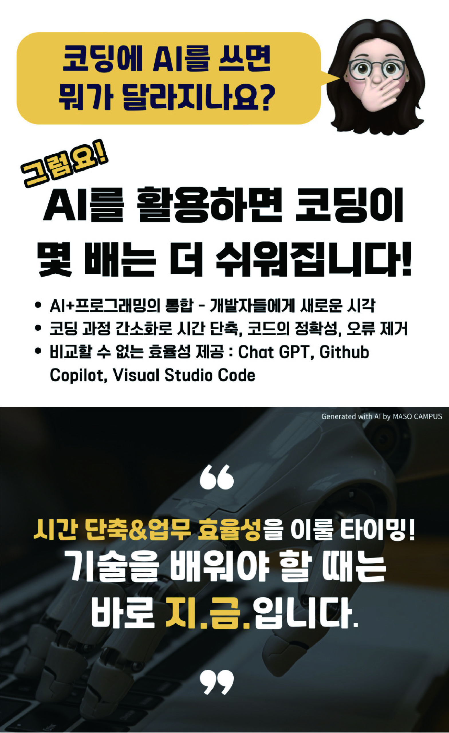 ▶ 수강자는 실무에 적용 가능한 프로그래밍 능력을 단기간 내에 향상시키며, AI 기술이해와 코딩 응용 방법 학습