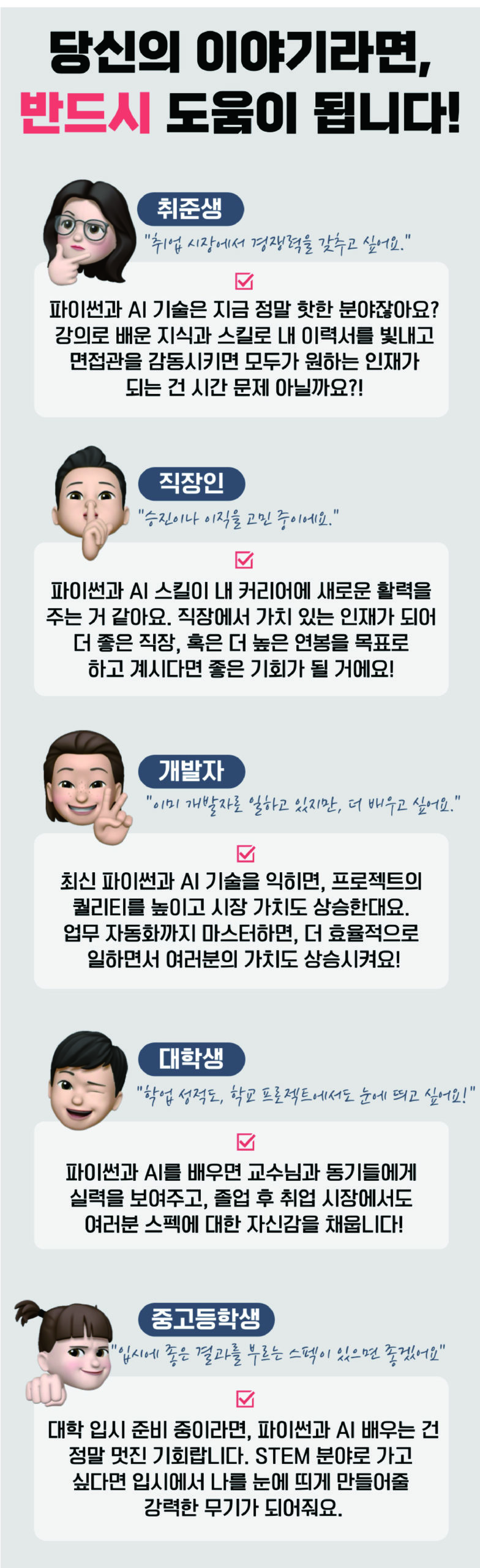 ▶ 파이썬을 통한 경력 발전을 목표로 하는 직장인, 승진이나 전직 희망자, 취업 준비생들에게 실질적인 도움을 제공