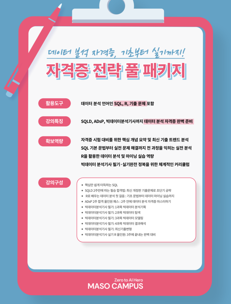 SQLD, ADsP, 빅데이터분석기사(필기+실기) 등 주요 자격증을 빠르고 전략적으로 준비할 수 있도록