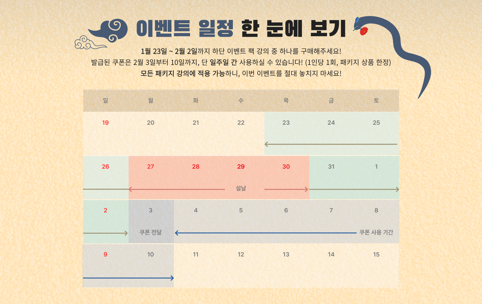 1월 23일 ~ 2월 2일까지 이벤트 패키지 중 원하는 강의를 구매해주세요!