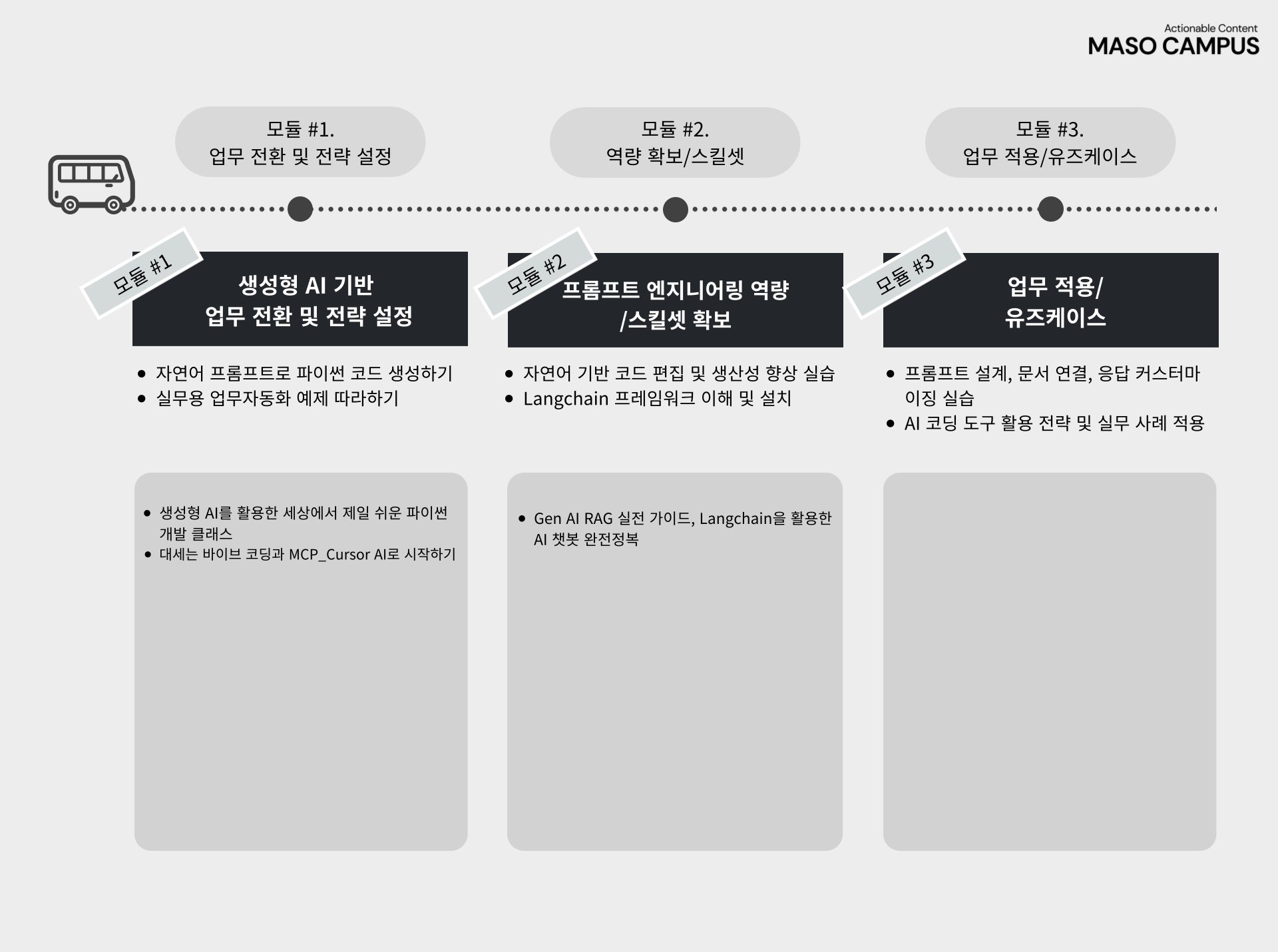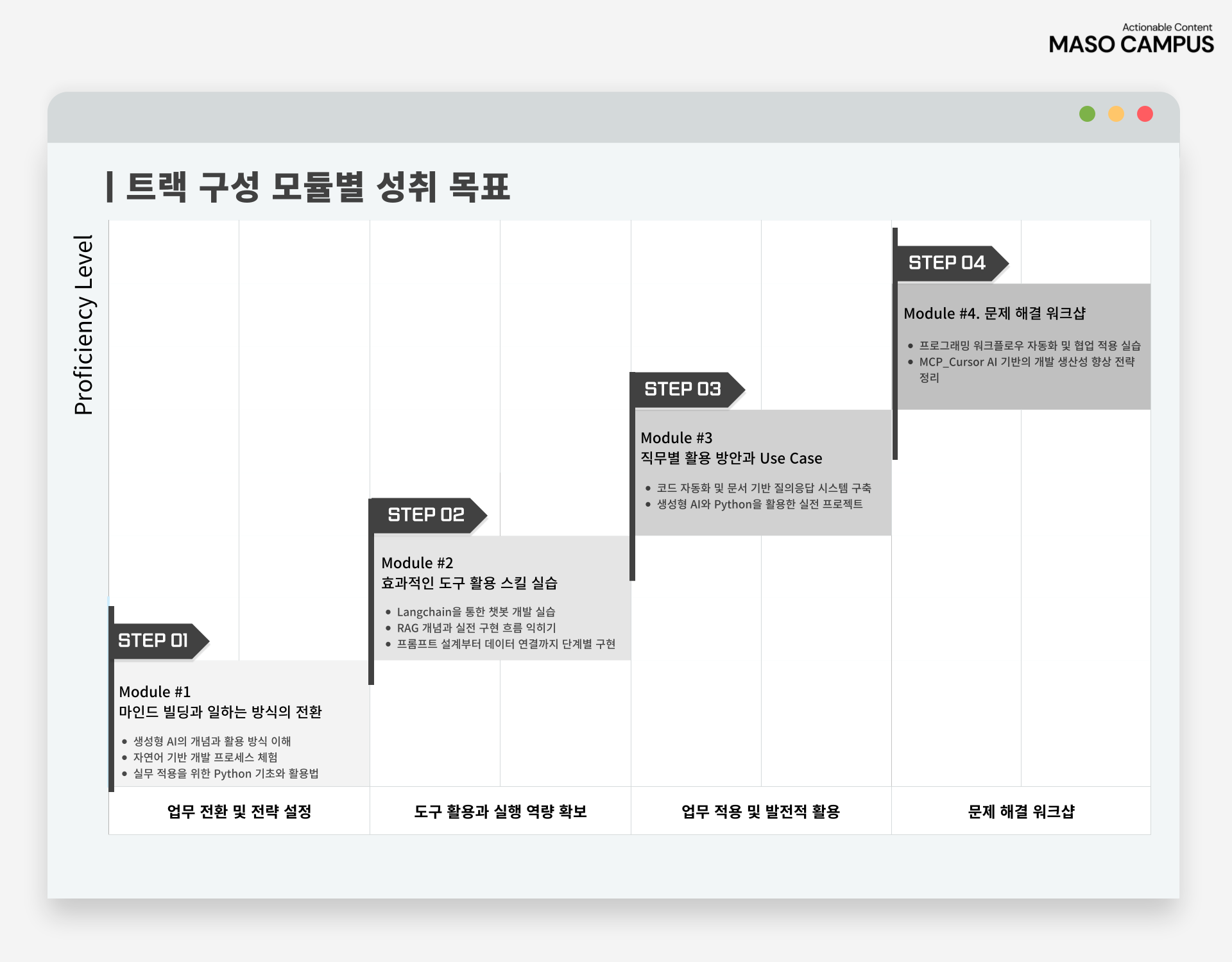 AI 기술과 생성형 AI 도구를 실무에 적용할 수 있는 깊이 있는 역량을 배양하는 데 중점을 둡니다.